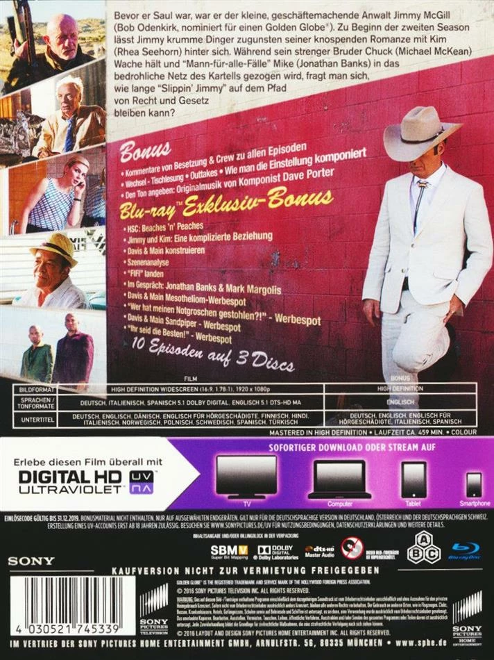 Bevor er Saul war, war er der kleine, geschäftemachende Anwalt Jimmy McGill (Bob Odenkirk, nominiert für einen Golden Globe®). Zu Beginn der zweiten Season lässt Jimmy krumme Dinger zugunsten seiner knospenden Romanze mit Kim (Rhea Seehorn) hinter sich. Während sein strenger Bruder Chuck (Michael McKean) Wache hält und « Mann-für-alle-Fälle » Mike (Jonathan Banks) in das bedrohliche Netz des Kartells gezogen wird fragt sich, wie lange « Slippin’ Jimmy » auf dem Pfad von Recht und Gesetz bleiben kann?