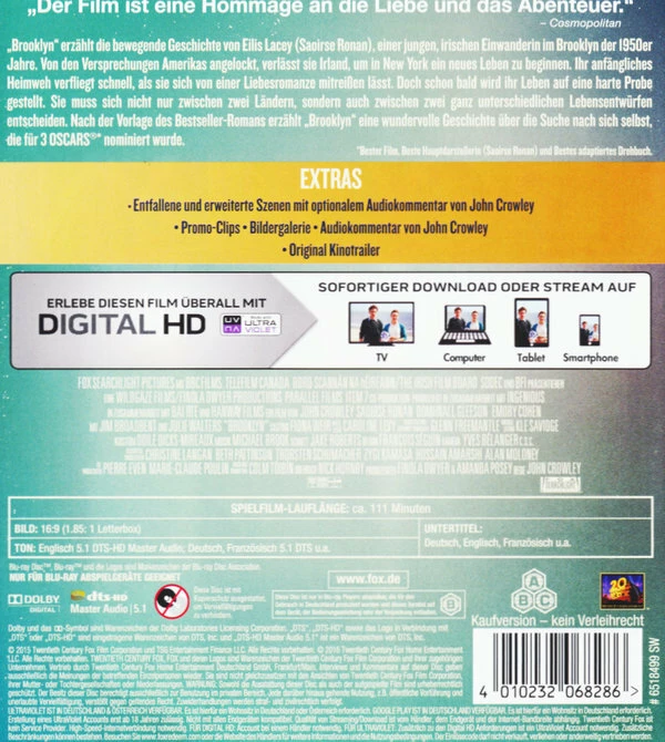 Die junge Irin Eilis Lacey lässt in den frühen 1950er Jahren Heimat und Familie hinter sich, um in New York die Chance auf ein besseres Leben zu ergreifen. In Brooklyn findet sie eine Anstellung in einem Modegeschäft und lernt auf einem irischen Tanzfest den italienisch stämmigen Amerikaner Tony kennen, der ihr hilft, sich in der Grossstadt einzuleben. Zwischen den beiden entwickelt sich trotz Vorbehalte von Tonys Familie eine intensive Liebesbeziehung, die aber zunehmend von Eilis‘ starkem Heimweh und der Sehnsucht nach ihrer Familie überschattet wird. Eine Familientragödie zwingt Eilis schliesslich dazu, nach Irland zurückzukehren, aber nicht, ehe Tony und sie den Bund fürs Leben eingehen. In Irland fühlen sich ihre alten Gefährten von der neuen Eilis vor den Kopf gestossen, aber bald schon findet sie bei alten und neuen Freunden Trost – insbesondere bei Jim. Bald schon sieht sich Eilis nicht nur vor der Wahl zwischen zwei Männern, sondern zwischen zwei Ländern gestellt.