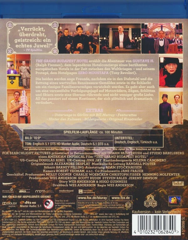« Grand Budapest Hotel » erzählt von den Abenteuern des Gustave H., dem legendären Concierge eines berühmten europäischen Hotels zwischen den Weltkriegen, und dem Lobby-Jungen Zero Moustafa, der zu seinem treusten Freund wurde. Die Geschichte involviert den Diebstahl und das Wiederauffinden eines unbezahlbaren Renaissance-Gemäldes sowie den Streit um ein enormes Familienvermögen – alles vor dem Hintergrund eines sich ebenso plötzlich wie dramatisch wandelnden Kontinents.