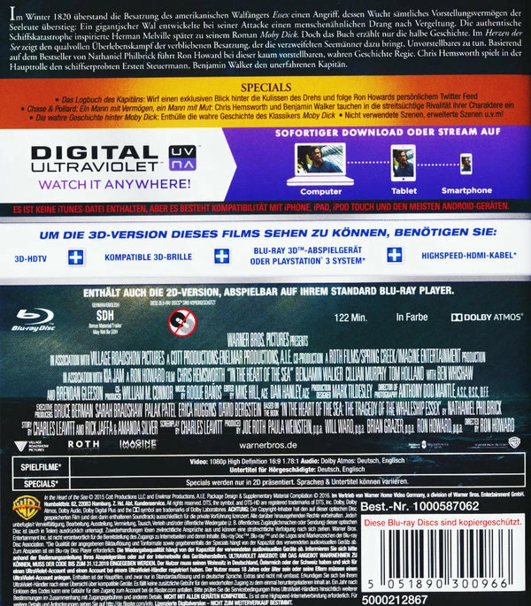 Im Winter 1820 überstand die Besatzung des amerikanischen Walfängers Essex einen Angriff, dessen Wucht sämtliches Vorstellungsvermögen der Seeleute überstieg: Ein gigantischer Wal entwickelte bei seiner Attacke einen menschenähnlichen Drang nach Vergeltung. Die authentische Schiffskatastrophe inspirierte Herman Melville später zu seinem Roman „Moby Dick“. Doch das Buch erzählt nur die halbe Geschichte. „Im Herzen der See“ zeigt den qualvollen Überlebenskampf der verbliebenen Besatzung, der die verzweifelten Seemänner dazu bringt, Unvorstellbares zu tun. Stürme, Hunger und Panik nötigen die Männer dazu, den Wert des menschlichen Lebens und die Ethik ihres Berufs infrage zu stellen, während sich der Kapitän auf dem offenen Meer zu orientieren versucht und der erste Offizier an seinem Plan festhält, den grossen Wal doch noch zu erlegen.
