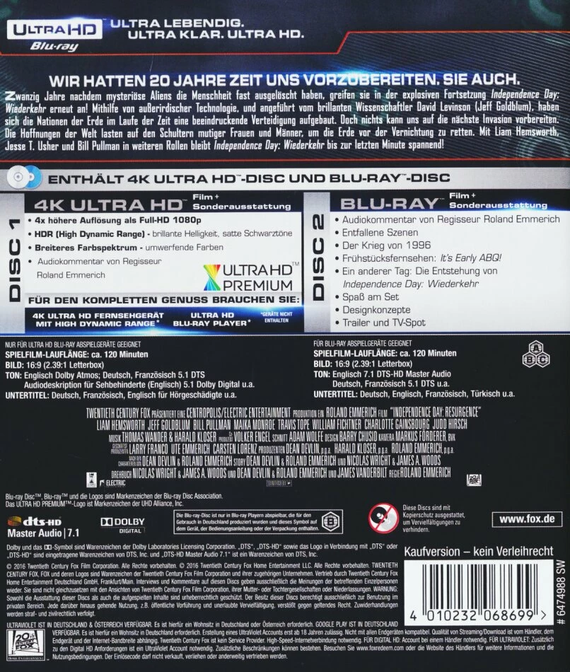 Zwanzig Jahre, nachdem die Amerikaner unter der Führung ihres Präsidenten Thomas Whitmore eine Alien-Invasion zurückschlagen konnten, droht ein erneuter Angriff der Ausserirdischen. Die Menschheit war in den vergangenen zwei Jahrzehnten nicht untätig und hat sich auf einen erneuten Angriff vorbereitet. Die auf der Erde zurückgebliebene Alien-Technologie wurde genutzt, um Waffen und Flugzeuge umzurüsten, ein gigantisches, globales Abwehrprogramm zu entwickeln – doch gegen die zurückgekehrten Aliens hilft das trotzdem nicht. Wieder hängt alles vom Einfallsreichtum einiger Menschen ab. U. a. Dylan Hiller, Sohn des heldenhaften Kampfpiloten Captain Steven Hiller, macht sich bereit, um gegen die Bedrohung vorzugehen…