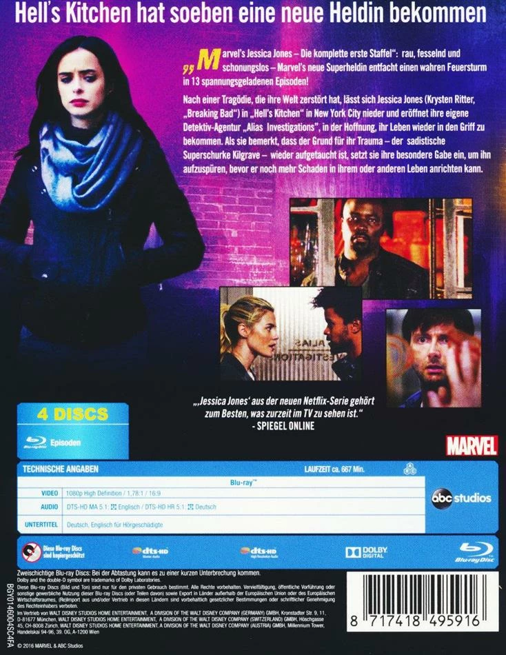 Rau, fesselnd und schonungslos – Marvel’s neue Superheldin entfacht einen wahren Feuersturm in 13 spannungsgeladenen Episoden! Nach einer Tragödie, die ihre Welt zerstört hat, lässt sich Jessica Jones in « Hell’s Kitchen » in New York City nieder und eröffnet ihre eigene Detektiv-Agentur , »Alias Investigations », in der Hoffnung, ihr Leben wieder in den Griff zu bekommen…