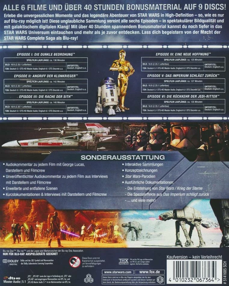 | Filmliste | Star Wars: Episode I – Die dunkle Bedrohung, Star Wars: Episode II – Angriff der Klonkrieger, Star Wars: Episode III – Die Rache der Sith, Star Wars: Episode IV – Eine neue Hoffnung, Star Wars: Episode V – Das Imperium schlägt zurück, Star Wars: Episode VI – Die Rückkehr der Jedi-Ritter |