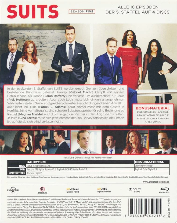 In der packenden 5. Staffel von Suits werden erneut Grenzen überschritten und Bündnisse getestet. Harvey kämpft mit seinem Gefühlschaos, als Donna ihn verlässt, um ausgerechnet für Louis zu arbeiten. Aber auch Louis muss sich einigen unangenehmen Wahrheiten stellen: Seine erfolgreiche Schwester braucht dringend einen Anwalt, aber nicht ihn. Mike gerät einmal mehr mit dem Gesetz in Konflikt. Seine Verhaftung ist eine schwere Belastungsprobe für seine Beziehung zu Rachel und droht sogar, die Kanzlei in den Abgrund zu reissen. Jessica muss sich jetzt entscheiden, ob Harvey tatsächlich die Person ist, auf die sie sich blind verlassen kann.