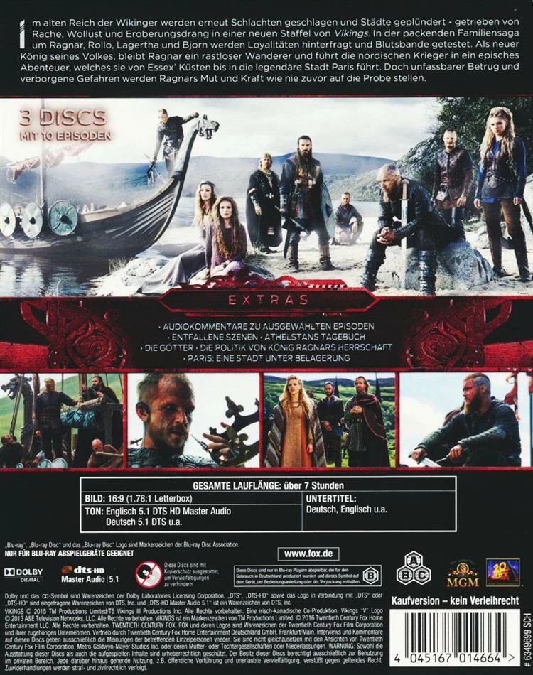 Im alten Reich der Wikinger werden erneut Schlachten geschlagen und Städte geplündert – getrieben von Rache, Wollust und Eroberungsdrang in einer neuen Staffel von Vikings. In der packenden Familiensaga um Ragnar, Rollo, Lagertha und Bjorn werden Loyalitäten hinterfragt und Blutsbande getestet. Als neuer König seines Volkes, bleibt Ragnar ein rastloser Wanderer und führt die nordischen Krieger in ein episches Abenteuer, welches sie von Essex’ Küsten bis in die legendäre Stadt Paris führt. Doch unfassbarer Betrug und verborgene Gefahren werden Ragnars Mut und Kraft wie nie zuvor auf die Probe stellen.
