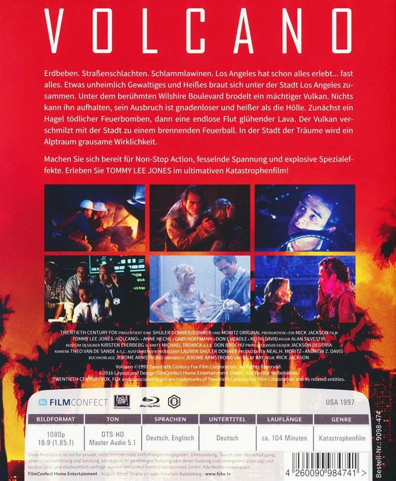 In dem Katastrophenfilm VOLCANO von Primetime Emmy®-Gewinner Mick Jackson (Bodyguard, Du gehst nicht allein) spielt Oscar®-Gewinner Tommy Lee Jones (Auf der Flucht, Lincoln) neben Anne Heche (Wag the Dog, Men in Trees) und dem Oscar®-nominierten Don Cheadle (Hotel Ruanda, L.A. Crash).